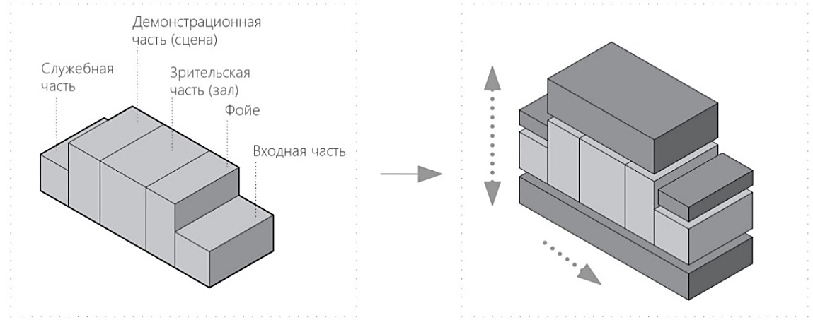 Рис. 4. Концептуальные схемы увеличения объемов здания и расширения функционала зрелищного объекта