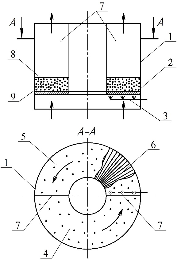 Принципиальная схема воздухоохладителей с дисперсной насадкой приведена на риc. 1 [4]. Их основным элементом является кольцевая рабочая камера 1, разделённая двумя перегородками 7 на «сухую» секцию 4 и «влажную» секцию 5. В перегородках выполнены переточные окна 8 для свободной циркуляции дисперсного материала (насадки) 9. Газораспределительное устройство 2 с наклонными лопатками 6 служит для формирования циркулирующего псевдоожиженного слоя. Форсунки 3 предназначены для увлажнения материала во «влажной» секции рабочей камеры.