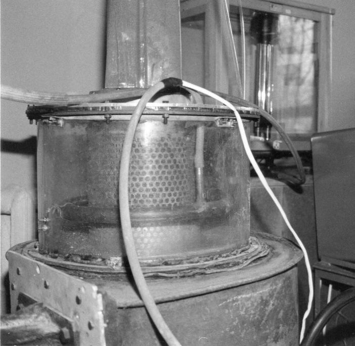 Основным его элементом является рабочая камера, в которой осуществляется процесс охлаждения воздуха. Общий вид рабочей камеры воздухоохладителя показан на риc. 2. Она образована двумя соосно расположенными обечайками, имеющими высоту 0,5 мм и диаметры 0,4 и 0,2 м, соответственно для внешней и внутренней. Для визуального наблюдения за процессом псевдоожижения внешняя обечайка изготовлена из органического стекла.