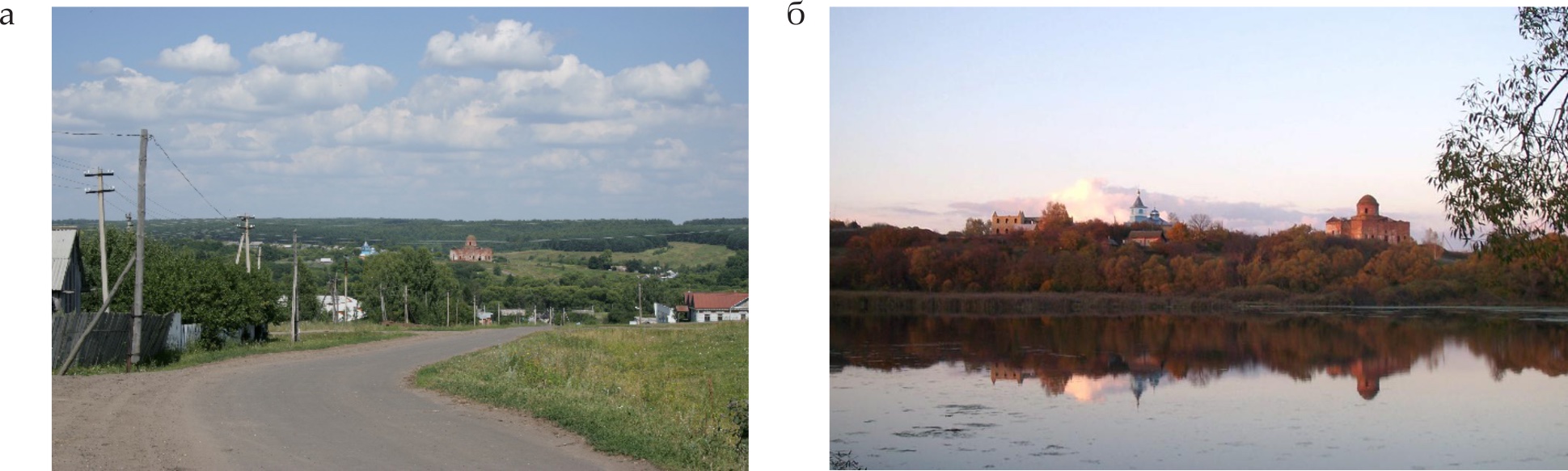 Рис. 1. Панорамы Троицкого храма с. Шейно, Пачелмский район: а – вид с центральной улицы; б – вид с противоположного холма