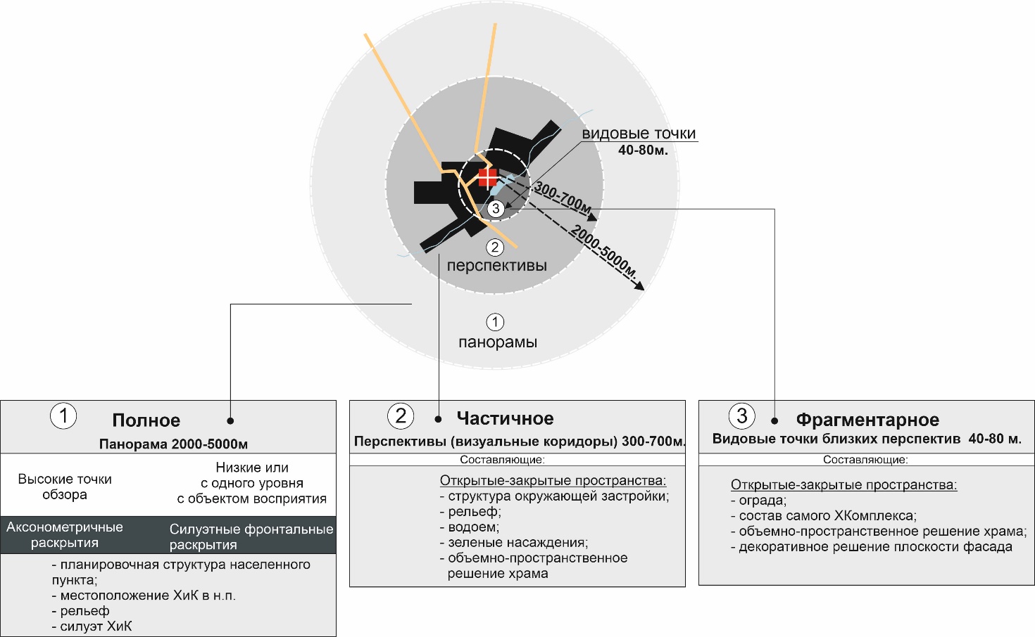 В зависимости от дистанции наблюдения выделяются три уровня или территориальные зоны с различными вариантами восприятия: зона дальних видов или полный панорамный обзор (от 1000 м), перспективные виды или объектный обзор (500–700 м) и ближние виды или детальный обзор (40–80 м). Рассмотрим их подробнее (риc. 2).