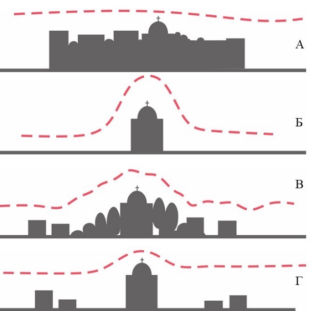 Были выделены характерные типы силуэтов ландшафтно-градостроительной ситуации вокруг православных храмов и комплексов (риc. 4):