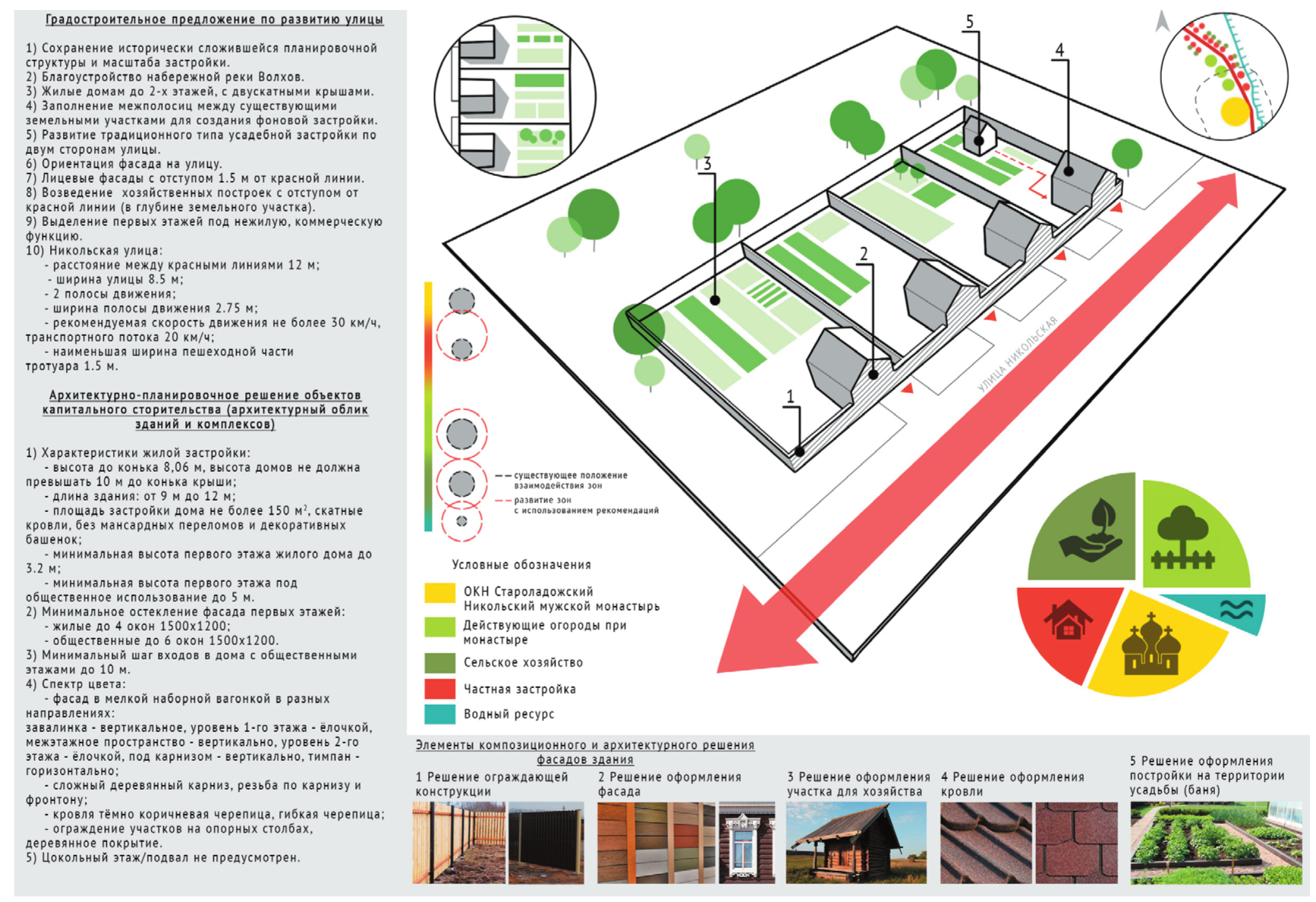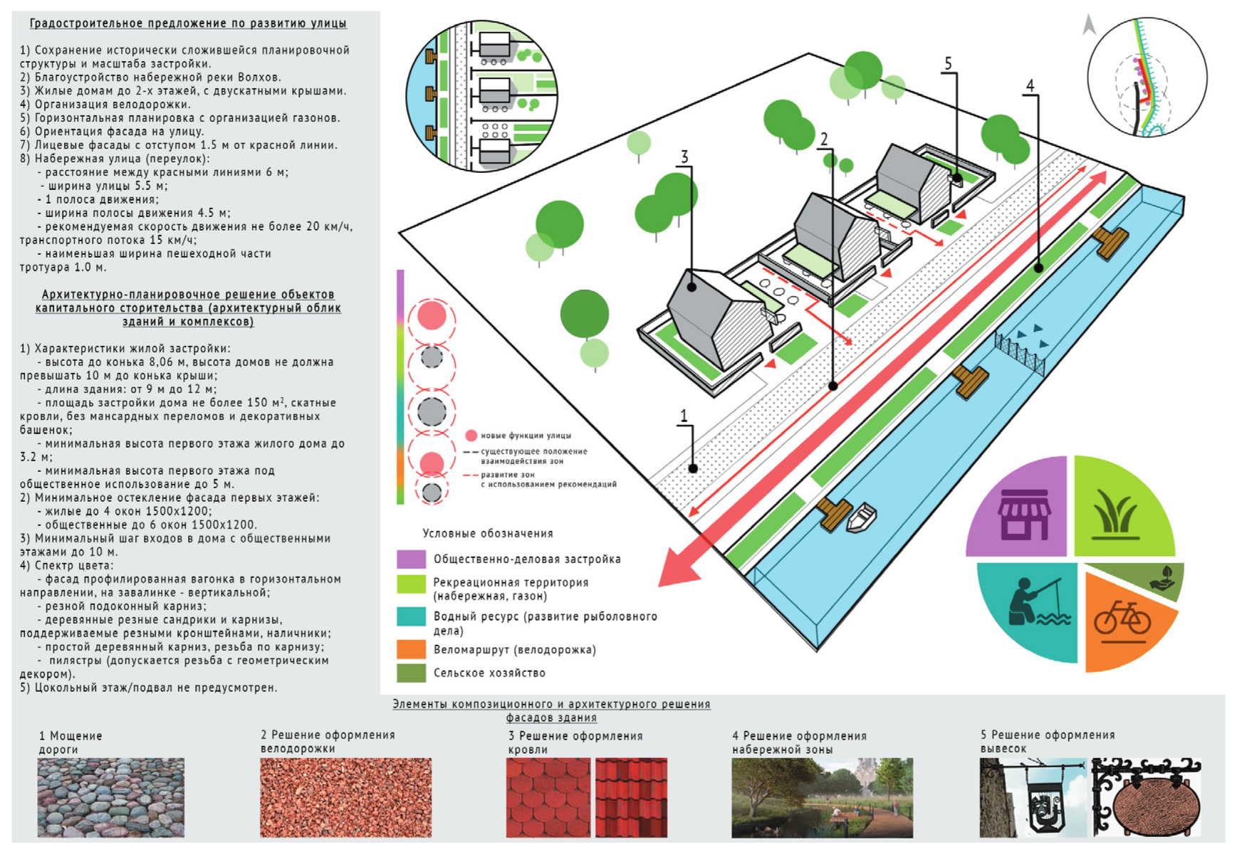 Улица Набережная (рис. 2) граничит с р. Волхов и ранее носила промысловый характер. На ней предлагается обустроить набережную для развития рыболовного промысла и создания целостной архитектурной панорамы с правого берега р. Волхов.