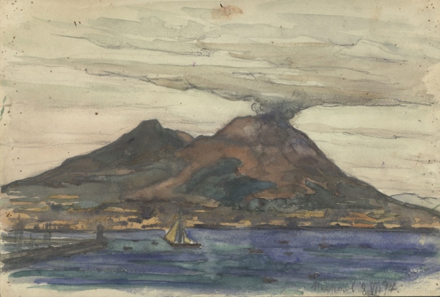 Основной темой в пейзажном жанре на протяжении всей его жизни было море. Изображение Неаполя с дымящимся на дальнем плане Везувием пробуждает воспоминание о трагедии 6 апреля 1906 г. День, когда «лавовые бомбы» – валуны пепла и камни весом до двух тонн – разрушали дома и церкви вместе с находившимися в них людьми, а горячие грязевые потоки и оползни уничтожали близлежащие территории. Контраст синевы морской глади и чернеющих треугольников вулканов, занимающих две трети листа, создает тревожное ощущение трагедии и хрупкости жизни в этом прекрасном уголке земли.