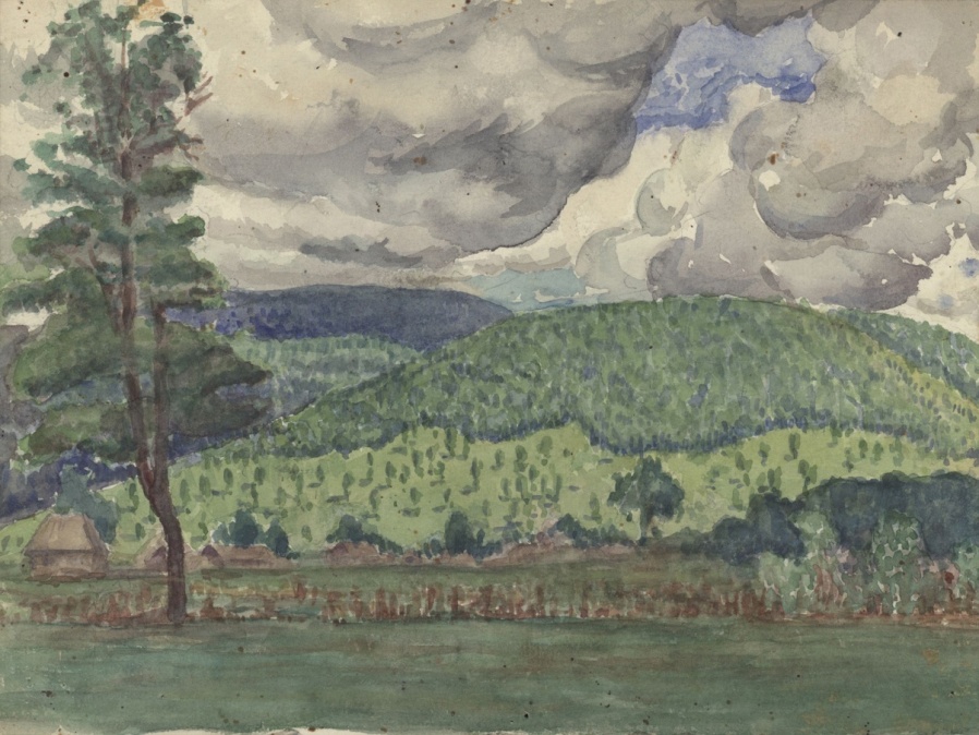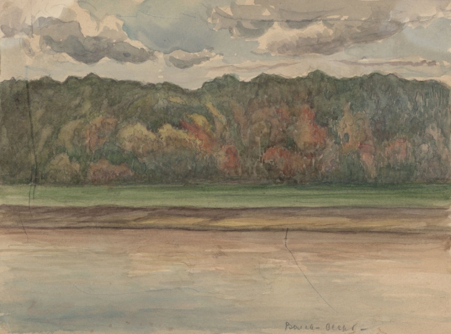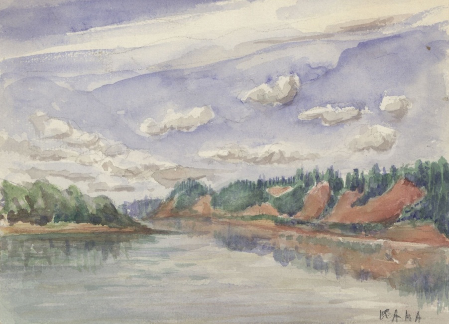 В акварели «Берега Камы» вполне жанровый сюжет: груженая баржа медленно движется по водной глади. Но кулисно расположенные холмы открывают дремучие леса, над ними золотое угасающее небо. Сдержанная цветовая гамма предполагает активное использование принципа теплохолодности и контраста тональных отношений. Работа лаконична и монументальна… «Русь святая»…