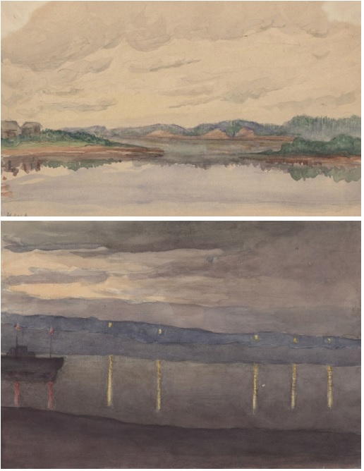 В путешествиях по Волге и Каме появляются изображения волжских берегов в разное время суток. Работа на пленэре позволяет выявить зависимость цветовых отношений от освещения и создать «колористический портрет» увиденного. Кажущаяся простота и легкость письма водяными красками на самом деле требует особой точности рисунка и цветового видения, безошибочности мазка, поскольку эта техника не любит поправок, счисток [3]. Выполненные в стилистике реализма эти работы часто приобретают романтический характер.