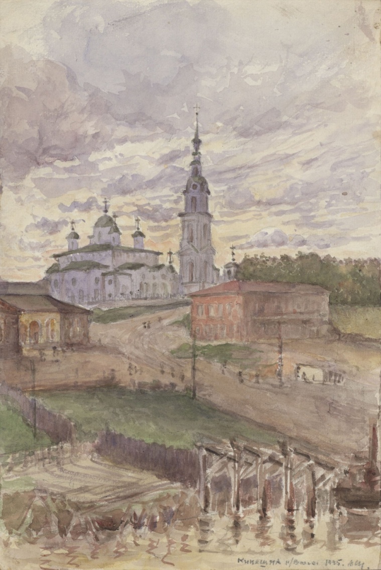 В работе «Кинешма на Волге»,1945 г. архитектура представляется частью природной среды. Подчиняясь логике уходящей дороги, взгляд зрителя движется к белокаменной церкви и колокольне, силуэтом выделяющимся на фоне золотого угасающего неба. Анализ цветовых сочетаний, которые характеризуют вечернее, дневное освещение, позволяет архитектору составить представление о цветовых гармонических модуляциях, востребованных в профессиональной деятельности [5].
