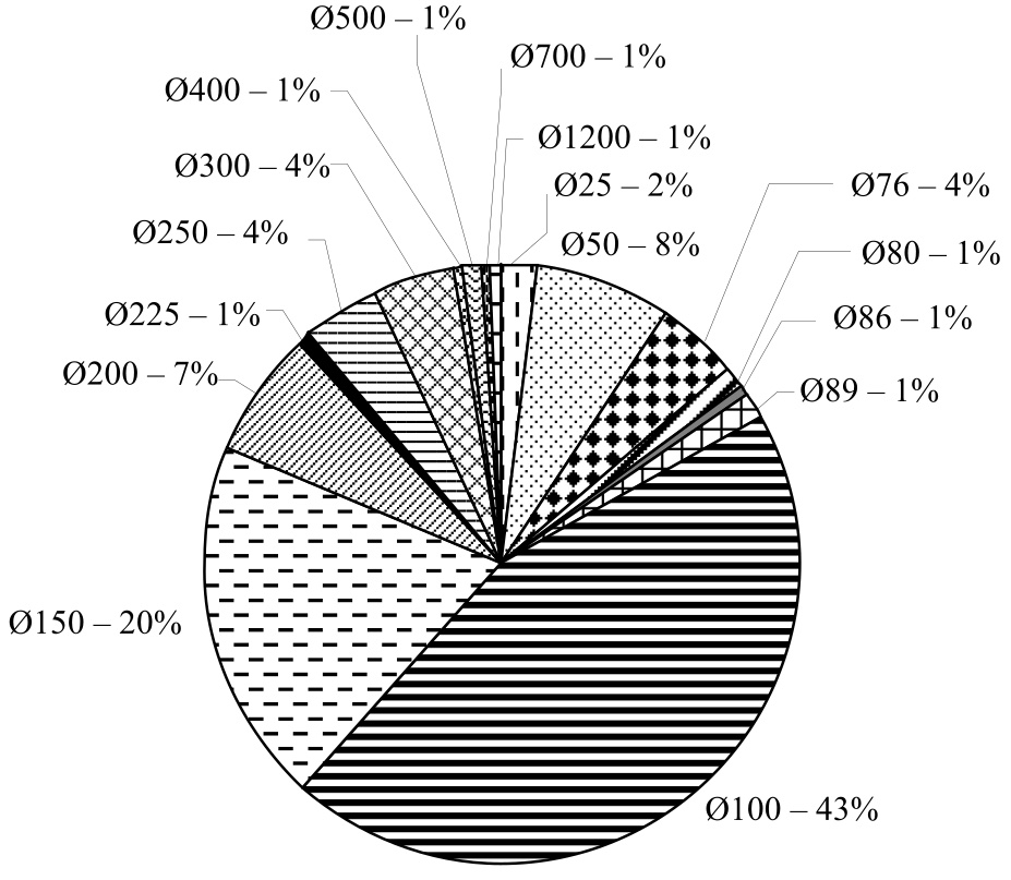 Согласно собранным данным сделан вывод, что наибольшее количество отказов (35 %) приходится на трубопроводы, находящиеся в грунте (в траншее). Причиной отказов служат свищи, коррозия (74 %), износ трубопровода (25 %), течь по сварному шву (1 %). Наиболее часто происходят отказы на сетях диаметром: 100 мм – 43 %,150 мм – 20 %, 200–300 мм – 17 %. На стальные трубопроводы приходится 86 % отказов. По состоянию на 2011 г. зафиксировано 459 отказов (из них: в колодце – 299 шт.; в траншее (на трубопроводе) – 160 шт.) на сетях водопровода, находящихся в эксплуатации организации водопроводно-канализационного хозяйства, а также на частных сетях водопровода (риc. 4–6). Под отказом понимается событие, когда сети и их элементы полностью или частично перестают выполнять свои функции, т. е. функции водообеспечения.