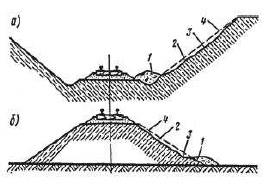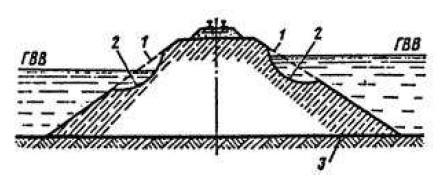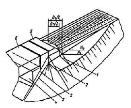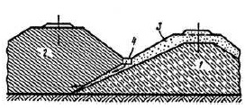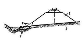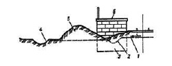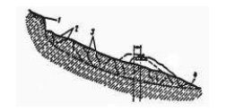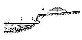 1 – уровень воды в водоеме; 2 – пляжные отложения; 3 – ниша подмыва берегового склона; 4 – продольная трещина закола | Подмыв берега (моря, озера, водохрани-лища) | Образование ниш на уровне горизонта воды, ширина естественного пляжа недостаточна | Сооружения недостаточны для защиты от водного объекта | Защита сооружения от водного объекта | ||