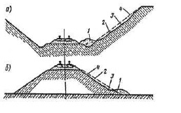 1 – брони срыва; 2 – оползневой массив; 3 – трещины на оползне; 4 – поверхность скольжения оползня | Оползни | Воздействие поверхностных и грунтовых вод, речной или морской абразией | Неудовлетворительный отвод поверхностных и грунтовых вод от верха насыпи | Организация отвода поверхностного стока и грунтовых вод | ||