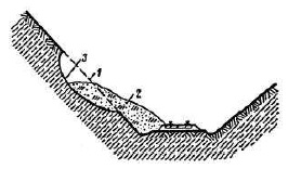 1 – отсос выемки до сплыва; 2 – сплывший грунт; 3 – поверхность скольжения | Сплывы откосов выемок и насыпей | За счет атмосферных вод смещение верхнего слоя грунта толщиной до 1-2 м | Отсутствие системы отвода поверхностных сточных вод | Организация отвода поверхностного стока | ||