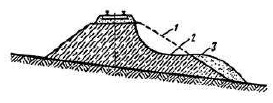 1 - ось первого пути; 2 – ось второго пути; 3 – присыпяемая под второй путь часть насыпи | Деформации насыпи второго пути в результате увлажнения грунта из балластного шлейфа, защемленного при строительстве второго пути | Просачивание воды на откосе | Неудовлетворительное содержание водоотводных и дренажных сооружений, выпусков воды из защемленных шлейфов | Содержание водоотводных и дренажных сооружений, выпусков воды из защемленных шлейфов в удовлетворительном состоянии | ||