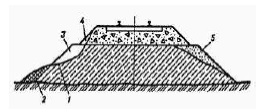 1 – поверхность смешения; 2 – сместившийся грунт; 3 – нарушенная часть откоса; 4 – поврежденная часть балластной призмы; 5 – балластный шлейф | Сдвиг (сползание) насыпи или ее низовой части по наклонному основанию | За счет атмосферных вод происходит отслоение части насыпи | Неудовлетворительный отвод поверхностных и грунтовых вод от основания насыпи | Организация отвода поверхностного стока и грунтовых вод | ||