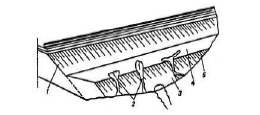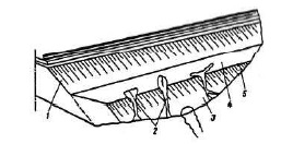 1 – балластный шлейф; 2 – построечное очертание откоса насыпи; 3 – эксплуатационное очертание откоса насыпи; 4 – устой моста; 5 – шкафная степса; 6 –пролетное строение | Повреждения земляного полотна при недостаточной длине водопропускной трубы | Отложения балластных материалов над водопропускными трубами; нависание дернин над трещинами; загромождение подводящих и отводящих русел посторонними предметами; застои воды у оснований откосов и их размывы | Неудовлетворительное содержание сооружений, подводящих и отводящих русел | Содержание регуляционных, струенаправляющих сооружений в удовлетворительном состоянии, реконструкция или капитальный ремонт водоспускных труб | ||