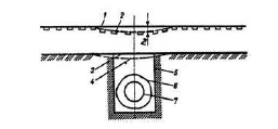 6 | 1 – первоначальный уровень головок рельсов; 2 – уровень головок рельсов после оседания пути; 3 – первоначальное положение основной площадки; 4 – то же после уплотнения грунта; 5 – граница разнородных грунтов; 6 – защитный кожух трубопровода; 7 – трубопровод | Повреждение в местах прокладки электрических кабелей | Повреждения приоткосных частей земляного полотна в местах прокладки кабелей | Застои воды в продольных углублениях на обочинах, несвоевременное устранение мелких промоин | Неудовлетворительное содержание водоотводных сооружений | Содержание водоотводных сооружений в удовлетворительном состоянии |