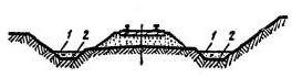 8 | 1 – земляное полотно первого пути; 2 – земляное полотно второго пути; 3 – балластный шлейф; 4 – водоотвод в пазухе между существующим и новым земляным полотном | Водоотвод между двумя и более путями; на разных уровнях путей | Переувлажнение грунта в откосах старой и вновь построенной насыпей вследствие неорганизованного водоотвода из уширенного междупутья | Застои воды в междупутных заглубленных пазухах; невыдержанные продольные уклоны и глубины водоотводов, удаляющих воду из широких междупутий | Запущенность имеющихся водоотводов | Содержание водоотводных сооружений в удовлетворительном состоянии, капитальный ремонт водоотводов |