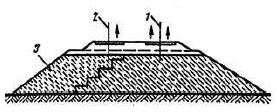 1 – первоначальный (построечный) профиль; 2 – поверхность скольжения; 3 –сползший грунт | Оползание откосов насыпи | За счет атмосферных вод происходит отслоение откосной части насыпи с захватом основной площадки | Отсутствие системы дренажа и отвода поверхностных сточных вод | Организация системы дренажа и отвода поверхностного стока | ||