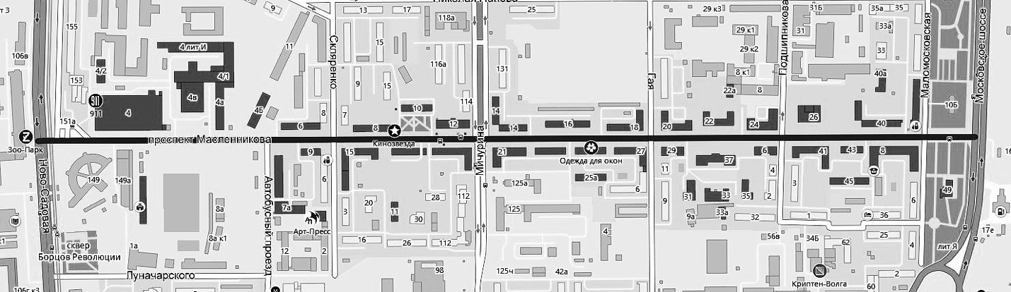 Основная часть. Застройка проезда Масленникова и превращение его в городскую магистраль стали продолжением развития рабочего поселка ЗиМа в границах улиц Ново-Садовой, Панова, Лукачева и Часовой. До войны здесь были построены жилые дома для рабочих завода, Дворец культуры, школы, детские сады, общежития, предприятия питания (в том числе – Фабрика-кухня архитектора Е.Н. Максимовой), спортивные сооружения. Пассажиропотоки влияли на трассировку маршрутов городского транспорта – трамвайные и автобусные остановки располагались напротив проходных завода, кольцо троллейбусной линии находилось на пересечении проспекта Масленникова и улицы Ново-Садовой. В 1950-е гг. фронт улицы, выходящий на Ново-Садовую, был реконструирован – изменены фасады зданий 1930-х гг. постройки, между существующими домами сделаны вставки в стиле советской классики.