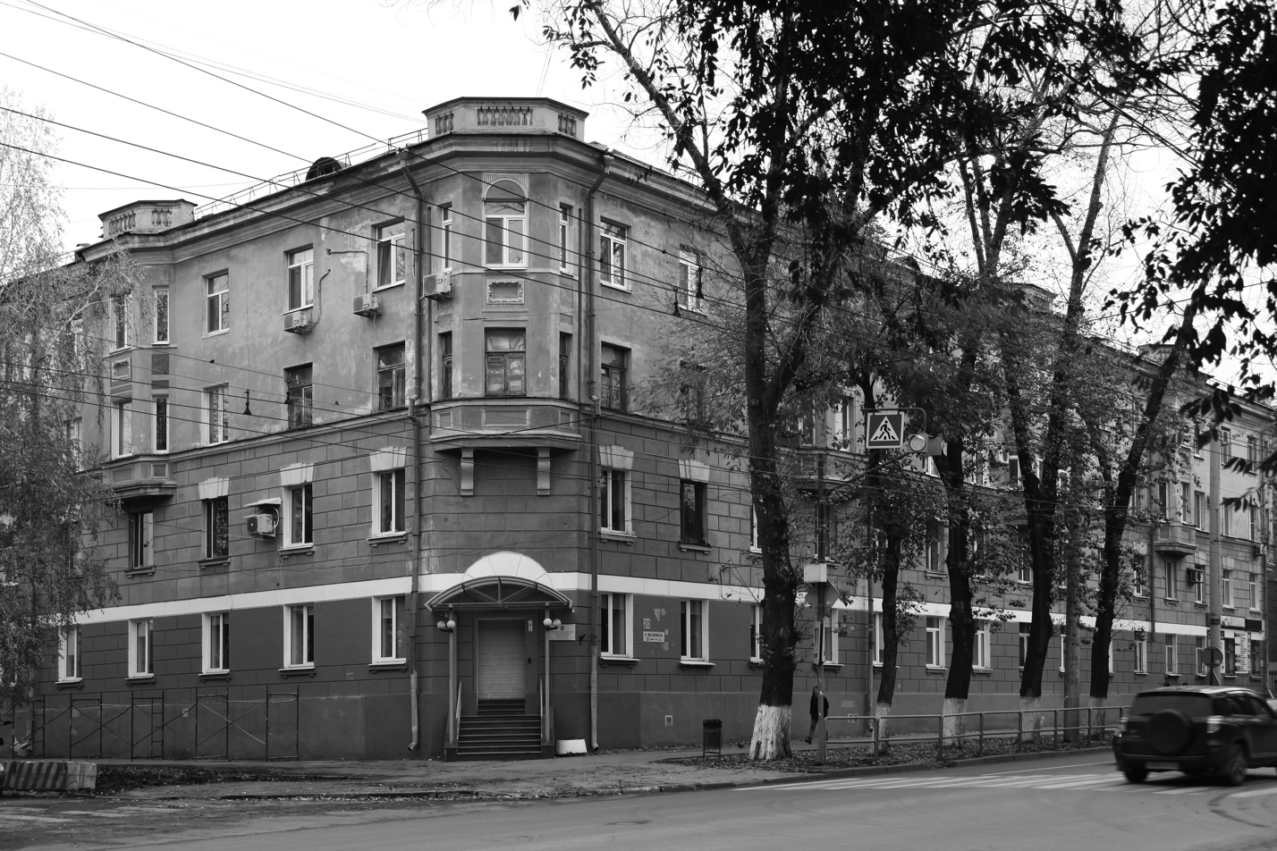 Жилые дома, пр. Масленникова, 20, 24, архитекторы А.Л. Каневский, М.Г. Мошкова, 1953–1955. На основании решения Куйбышевского горисполкома от 19 апреля 1951 года № 395 квартирно-эксплуатационному управлению ПриВО был отведен в бессрочное пользование земельный участок площадью 4 га в квартале № 376 Сталинского района г. Куйбышева по проезду Масленникова (в настоящее время – Октябрьский район г. Самары) для капитального строительства. В квартале, ограниченном пр. Масленникова, улицами Ботанической (ныне – Гая), Подшипниковой, Мопровской (ныне – Николая Панова), предполагалось построить два угловых дома с повторениями (дома № 20 и № 24). За основу был принят проект, разработанный проектной конторой горотдела по делам архитектуры. Этот проект был осуществлен ранее на пересечении улиц Молодогвардейской и Л. Толстого. Распоряжением Куйбышевского горисполкома от 22 июля 1955 года № 364-р был утвержден акт приемочной комиссии о сдаче в эксплуатацию жилой части дома (строительный № 3/86) на 41 квартиру и спецподвала по пр. Масленникова и ул. Ботанической в квартале № 376 Сталинского района (в настоящее время – жилой дом № 20). Проект, утвержденный начальником строительства и расквартирования войск МО СССР 18 июня 1953 года, был выполнен институтом 347 Военпроект. Проектное задание рассмотрено на заседании архитектурной комиссии при начальнике отдела по делам архитектуры исполкома Куйбышевского городского Совета депутатов трудящихся 4 марта 1953 года. Экспертом, архитектором С.К. Ефремовым, были внесены следующие предложения: «...на главном фасаде – под угловым эркером запроектированы кронштейны, а под другими, такими же по форме эркерами их нет – желательно уравновесить одинаковые эркеры в деталях». Сооружение здания было начато 18 мая 1953 года и полностью завершено в июле 1955 года. Здание 4-этажное, кирпичное, состоит из четырех секций. Оба здания имеют все виды инженерно-коммуникационных сетей: центральное отопление, водопровод, электроосвещение, канализацию, газоснабжение [5–7].