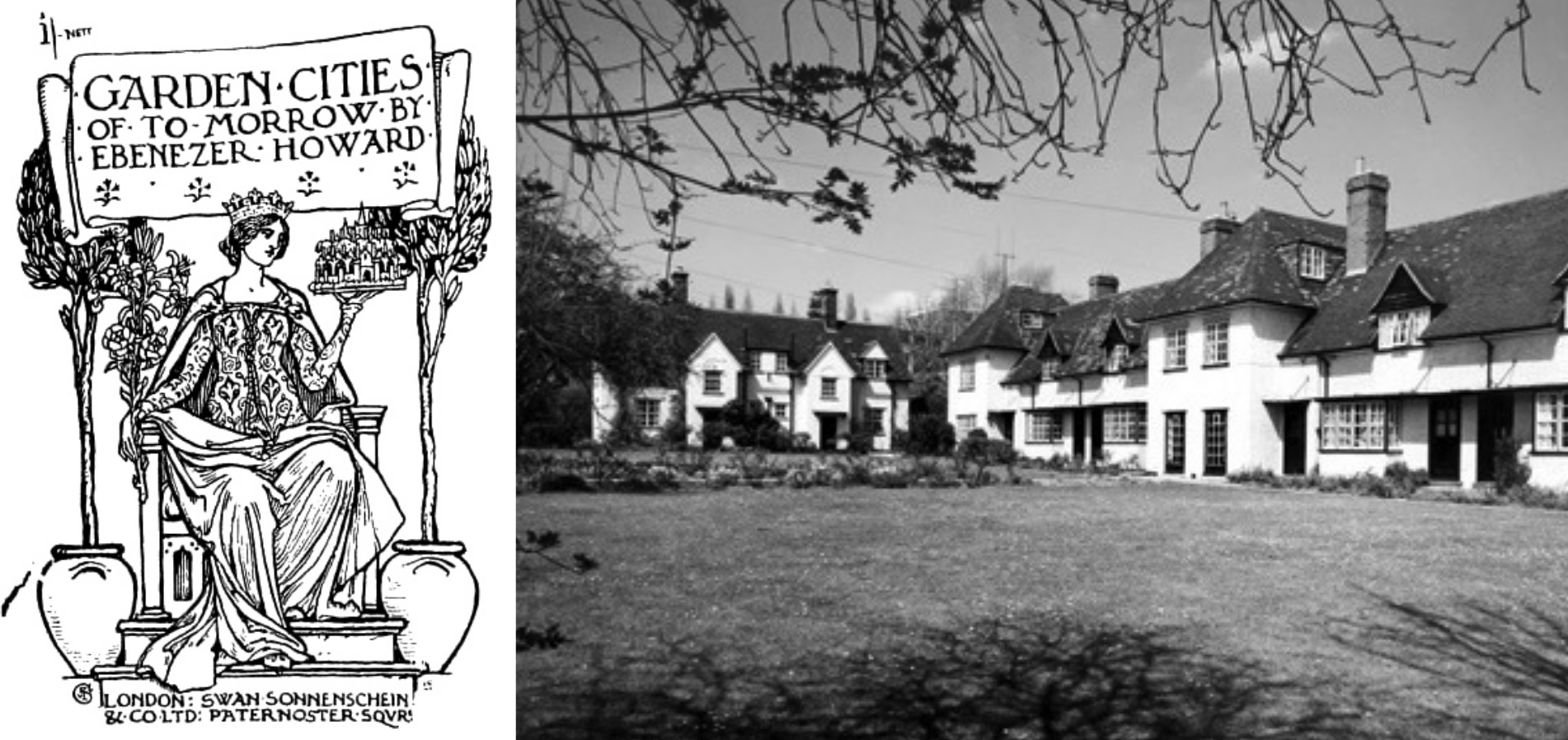Риc. 2. Фронтиспис книги Эбенизера Говарда «Города-сады будущего», 1902 и дома на Зелёной Луговой дороге (Meadow Way Green), Лечуорт, 1914, арх. Раймонд Анвин и Ричард Барри Паркер, фото Nicholas Breach, 1974