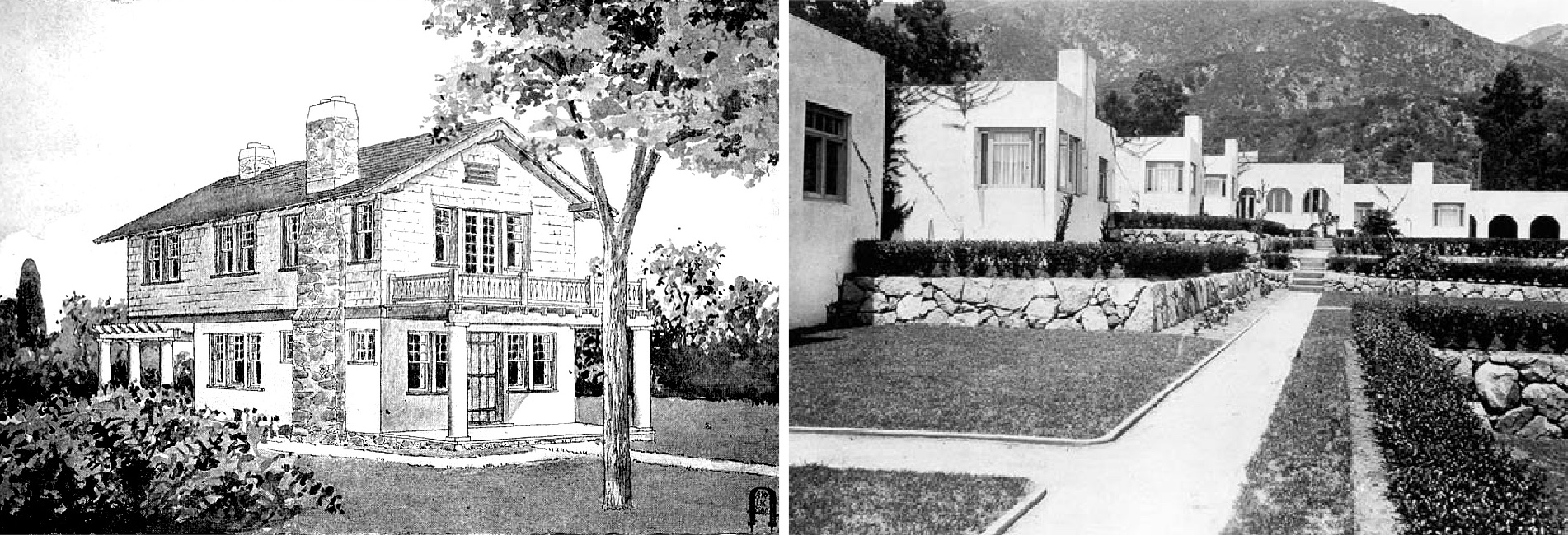Риc. 4. «Дом мастера», арх. Густав Стикли (The Craftsman, Vol. XVI, No. 2, May 1909) и Терраса Белла Виста (Двор Льюиса,1910) в Сьерра-Мадре, Калифорния, арх. Ирвинг Джон Гилл (Vol. XXII, No. 5, August 1912)