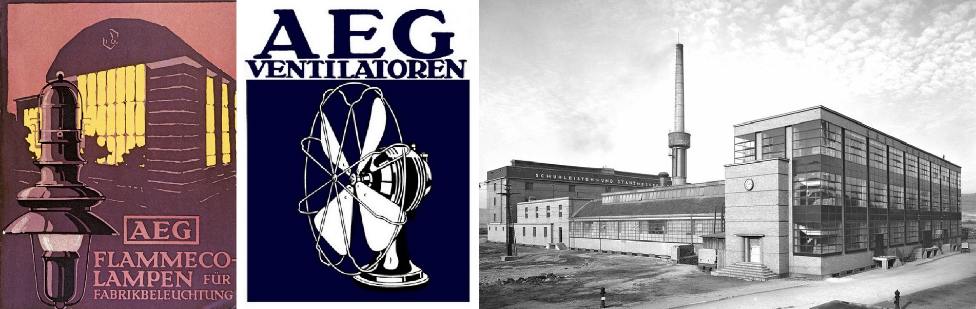 Риc. 6. Немецкий Веркбунд. Петер Беренс: плакаты в фирменном стиле концерна AEG, 1910-1912 [16]; Вальтер Гропиус: обувная фабрика Фагус, Альфельд, 1911 (фото 1911 г., ndr.de).