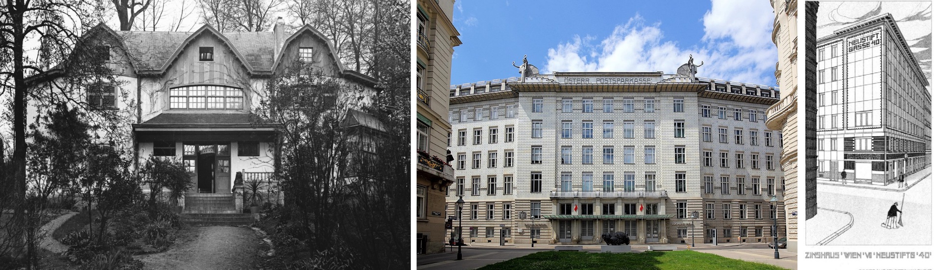 Риc. 9. Вилла «Цветочный двор», 1896, арх. Анри ван де Вельде; Почтовый сберегательный банк, Вена, 1906, арх. Отто Вагнер; Доходный дом на Нойштифтгассе 40, Вена, 1912, рисунок Отто Вагнера