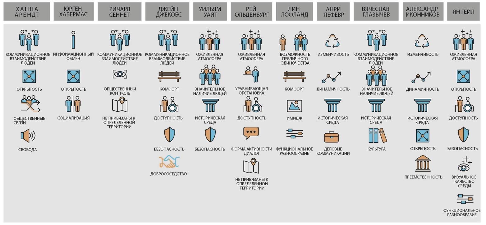 Исследования Юргена Хабермаса [2] во многом схожи с точкой зрения определения общественных пространств Ханны Арендт. Для обоих подходов основополагающие характеристики – открытость и социализация, побуждающая людей к взаимодействию. Хабермас трактовал публичное пространство как место сосредоточения людей, обсуждающих текущие события. Хабермас в качестве общественных пространств не ограничивался городскими площадями и центрами, как делала Арендт. Он рассматривал все пространства, где есть коммуникационное взаимодействие людей, потому что публичные пространства могут быть рассеяны и располагаться в любых местах. Одними из примеров, которые он приводил, были кафе, чайные салоны, периодика и медиа. Информация играла основополагающую роль в его концепции публичного пространства, так как она носит сетевой характер, где передаётся и воспроизводится в процессе коммуникационного воздействия. Профессор социолог Ричард Сеннет, так же как Х. Арендт и Ю. Хабермас, связывал публичное место с социальным фактором и взаимодействием незнакомых людей в определённом пространстве. Общественное место не имеет привязанности к центральным узлам города, главной и определяющей характеристикой для Сеннета было действие. То, что происходит в пространстве и месте, делает возможным проведение определённых активностей, которые не осуществить в рамках приватной сферы [3]. Проанализировав перечисленные концепции философов-теоретиков, в определении общественного места можно выделить основные критерии таких пространств: