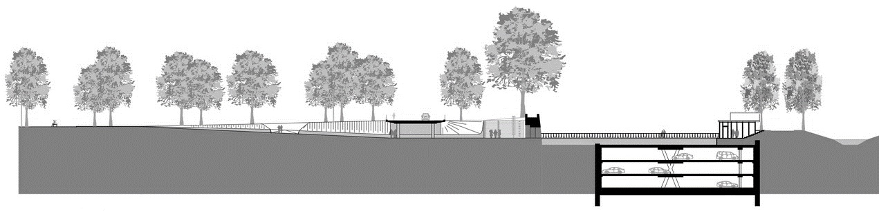 Проект Zuiderpark – Stadswalzone (Хертогенбос, Нидерланды, 2015 г.) [20] предусматривал строительство подземной автостоянки под достаточно сложным участком города большой исторической значимости (риc. 2). Жители и гости города Хертогенбос попадают в гараж Св. Иоанна по спиральной рампе в бастионе «Baselaar» (риc. 3). После парковки автомобиля в просторном и комфортабельном паркинге они проходят к главной лестнице через коридор, в котором представлены различные произведения искусства.