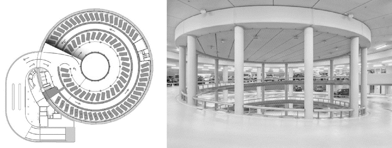 Паркинг представляет собой цилиндрическую структуру, в которой парковочные места радиально расходятся от спиральной рампы, проходящей через все сооружение. Цилиндрическая форма одновременно облегчает движение внутри паркинга, а также повышает удельную вместимость паркинга в сравнении с паркингом ортогональной схемы за счет экономии площади на второстепенных проездах.