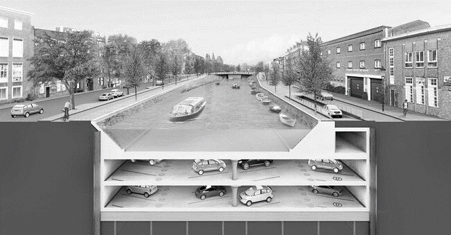 Стоит рассмотреть еще один необычный проект, реализованный в Нидерландах в Амстердаме (Albert Cuyp Parking Garage Amsterdam, 2019 г.) [22]. Решение о строительстве данного паркинга было принято городским советом Амстердама в 2017 г. 600 парковочных мест были перенесены с улицы Альберта Кейпа под разделяющий ее канал (риc. 8).
