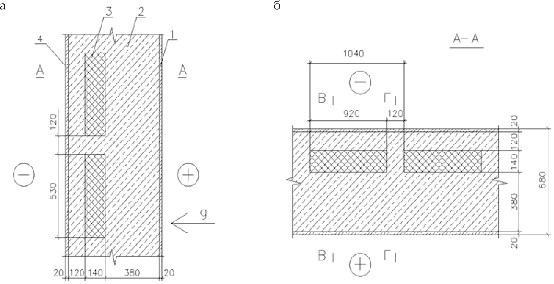 Риc. 1. Фрагмент наружной стены: а – сечение по стене; б – план кладки