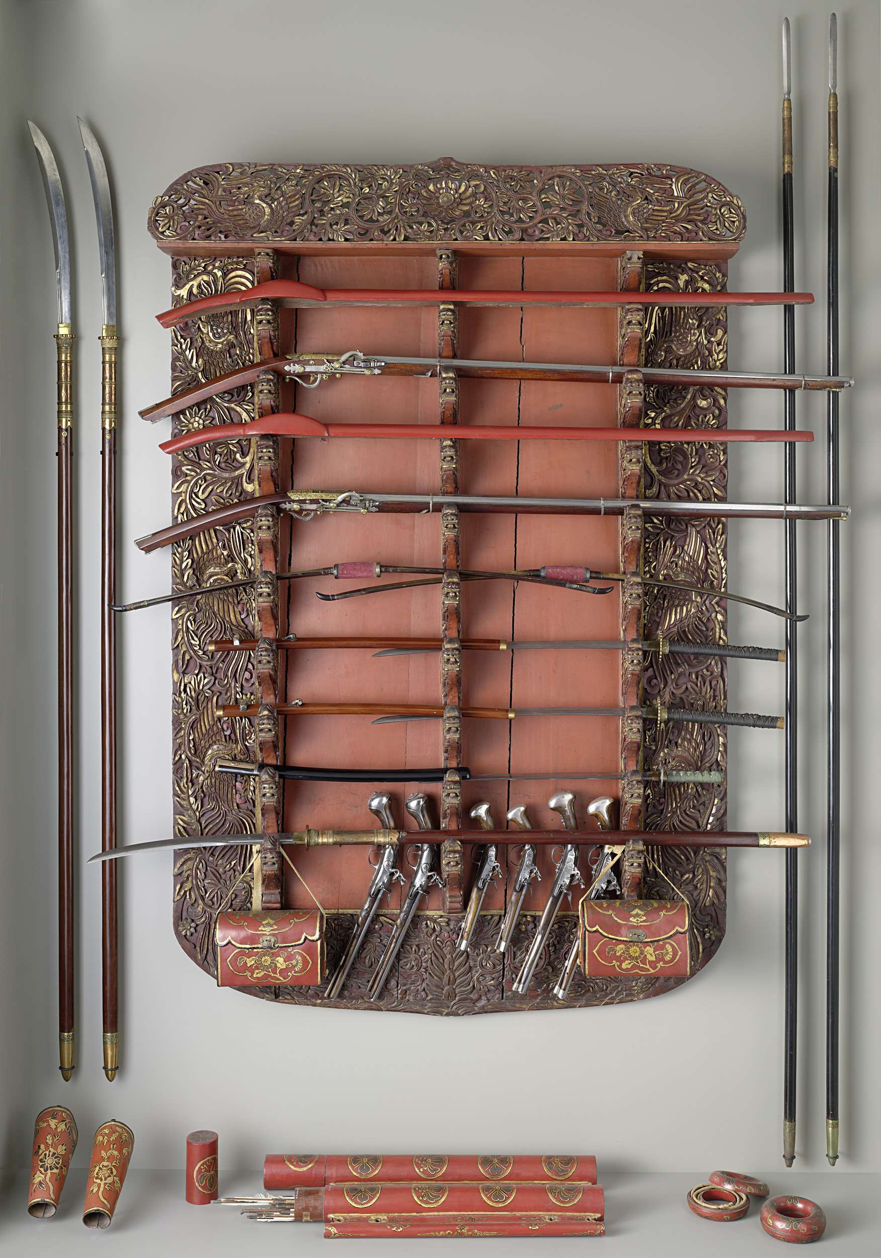 Это прямоугольная (200х132 см) стойка из нескольких досок дерева джати1, обрамлённая резной рамой с растительным орнаментом и фигурами фениксов. Перпендикулярно основной плоскости расположены три параллельных ряда изящно изогнутых выступов, функционально являющихся полками и крючками одновременно (по десять в каждом ряду). Каждый выступ завершается резным изображением головы фантастического животного, сжимающей в пасти жемчужину. Дерево покрыто красным лаком, а на резных частях сохранилась позолота. Вся конструкция вертикально крепится к стене. На стойке размещён набор вооружения и дополнительных аксессуаров (инвентарные номера с NG-NM-6088 по NG-NM-6099). Он включает две парные длинные пики, три боевые косы, две длинные и одну короткую сабли, два композитных лука (прилагаются колчаны с набором стрел, наручи и браслеты для лучника), а также две фитильные аркебузы (прилагаются необычного вида крышки-накладки, две патронные сумки и круглые коробки с фитилями). Экспонаты находятся в прекрасной сохранности. Клинки и наконечники начищены до блеска и не имеют следов ржавчины.