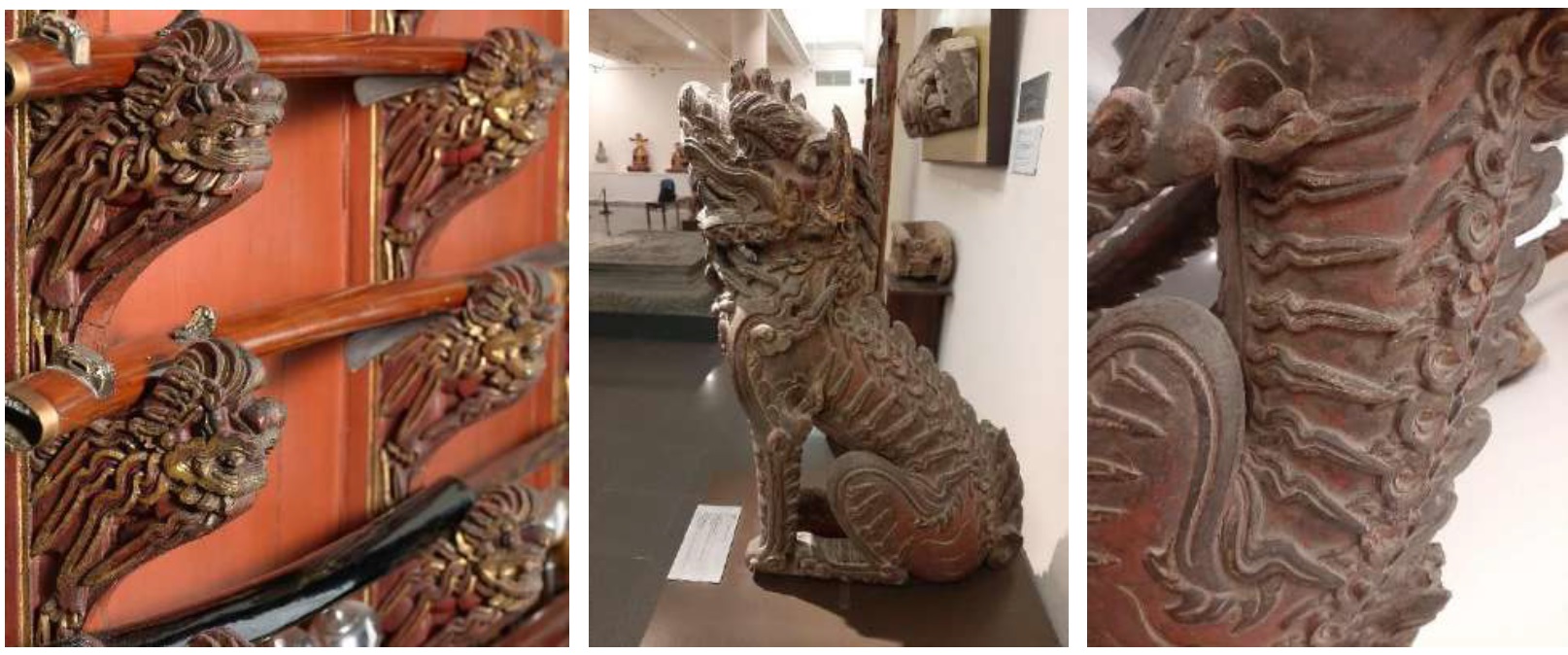 Рис. 3. Слева – фрагмент стойки NG-NM-6087-A. Выступы, декорированные головами нге. Фото: Rijksmuseum, Amsterdam. В середине – статуя нге из общинного дома Лау Тхыонг, пров. Футхо. Справа – фрагмент статуи. Музей искусств Вьетнама, Ханой. Фото автора, январь 2022 г.