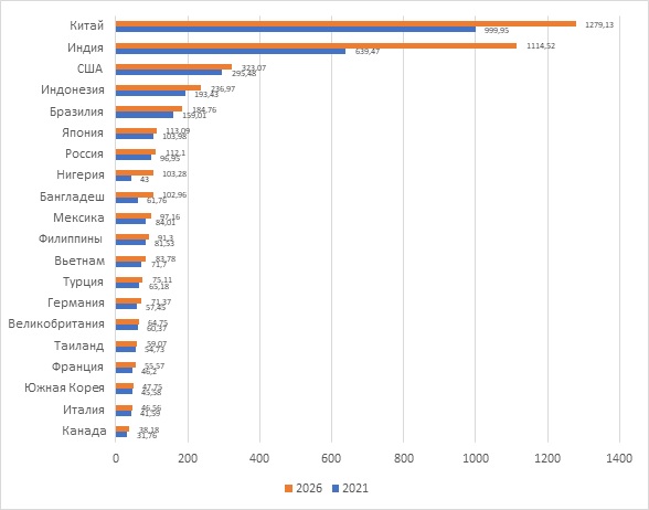 Рис. 2. Количество пользователей социальных сетей в отдельных странах в 2021 и 2026 г. (млн человек). Источник: [Statista: 16.05.2022]