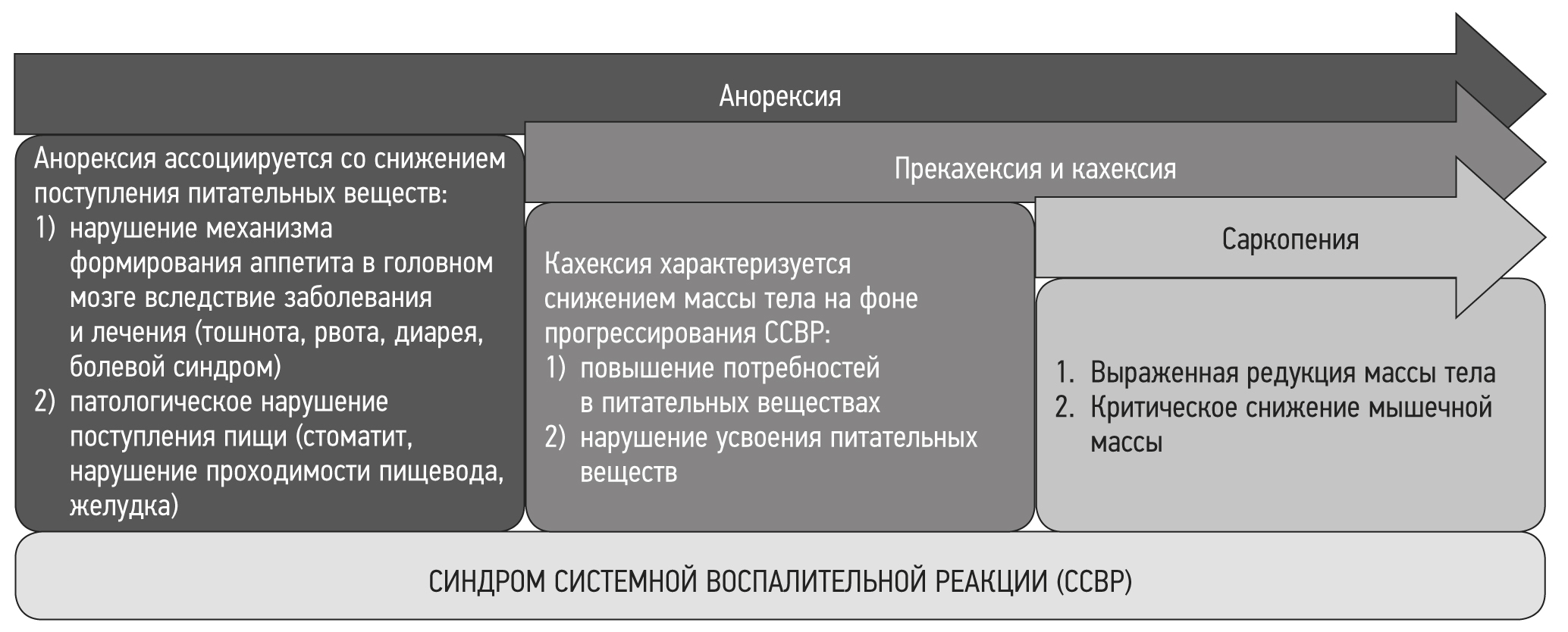 В настоящий момент имеются достаточно чёткие представления о патогенезе развития недостаточности питания у онкологического больного и методах её диагностики. Однако для конкретного пациента крайне важно понимать, какие процессы являются ведущими в развитии синдрома анорексии-кахексии. Такие понятия, как анорексия, кахексия, саркопения, отражают различные возможные варианты течения или стадии развития нарушения метаболических процессов. Их своевременное выявление позволяет определить длительность, интенсивность процесса, оценить прогноз течения заболевания, а также разработать пациент-ориентированную программу нутритивной поддержки. Этим и обусловлена важность чёткого определения данных понятий, в которых необходимо отразить суть патологического процесса.