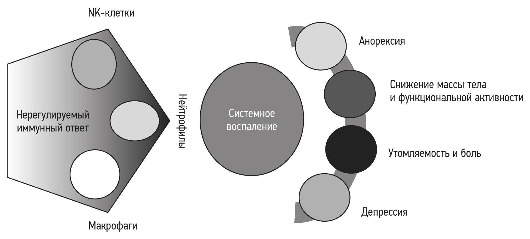 Достаточно часто встречаются такие симптомы, как депрессия, боль, быстрая утомляемость [23, 24]. Эти симптомы ассоциируются с качеством жизни и выживаемостью пациентов. Показано, что на интенсивность этих симптомов существенное влияние оказывают патологические реакции со стороны иммунной системы (рис. 2) [25–27]. Маркерами неблагоприятного исхода следует считать нарастание уровня С-реактивного белка и других белков острой фазы, гипоальбуминемию или комбинацию этих признаков. К факторам, свидетельствующим о прогрессировании недостаточности питания, относят нарастание уровня нейтрофилов, снижение абсолютного числа лимфоцитов и высокое соотношение нейтрофилов к лимфоцитам [28–30].