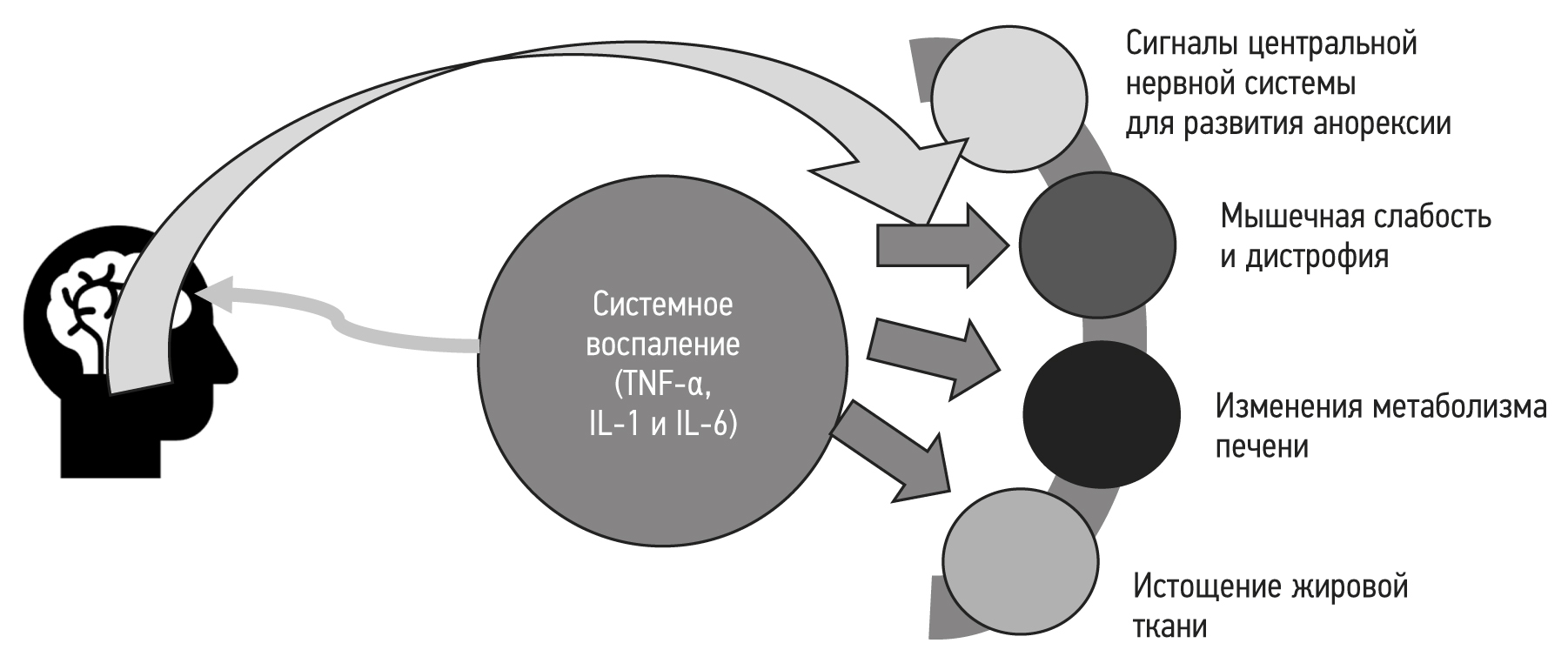 Развитие опухоли сопровождается активной продукцией различных провоспалительных цитокинов, таких как интерлейкины 1, 6, фактор некроза опухоли и др. [31–33]. Провоспалительные цитокины оказывают значительное влияние на различные метаболические и регуляторные процессы. Так, наблюдается нарушение аппетита, что приводит к анорексии [34]. На фоне синтеза печенью белков острой фазы одновременно активизируется протеолиз, особенно белков скелетной мускулатуры. Результатом этих изменений является снижение мышечной силы и, как следствие, существенное снижение физической активности пациента [34–36]. Вследствие развития синдрома гиперметаболизма также отмечается незавершённый липолиз, который, с одной стороны, приводит к истощению энергетического субстрата для организма, с другой ― не обеспечивает в достаточной мере потребности в энергии [37, 38]. Кроме того, циркулирующие провоспалительные цитокины, стимулируя синтез белков острой фазы, оказывают влияние на скорость выведения лекарственных препаратов печенью, тем самым создавая условия для их накопления и токсического действия на органы и ткани.