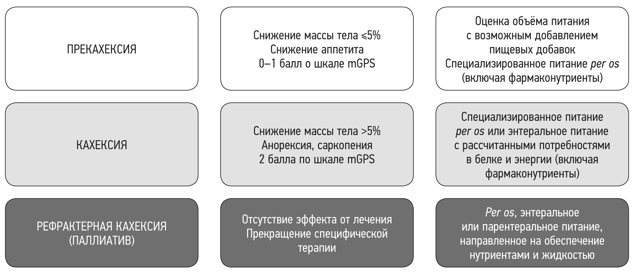 Прекахексия ― состояние, включающее ранние признаки кахексии, проявления которых обусловлены видом новообразования, стадией процесса, степенью выраженности синдрома системной воспалительной реакции и ответом на проводимую специфическую терапию [2, 8].