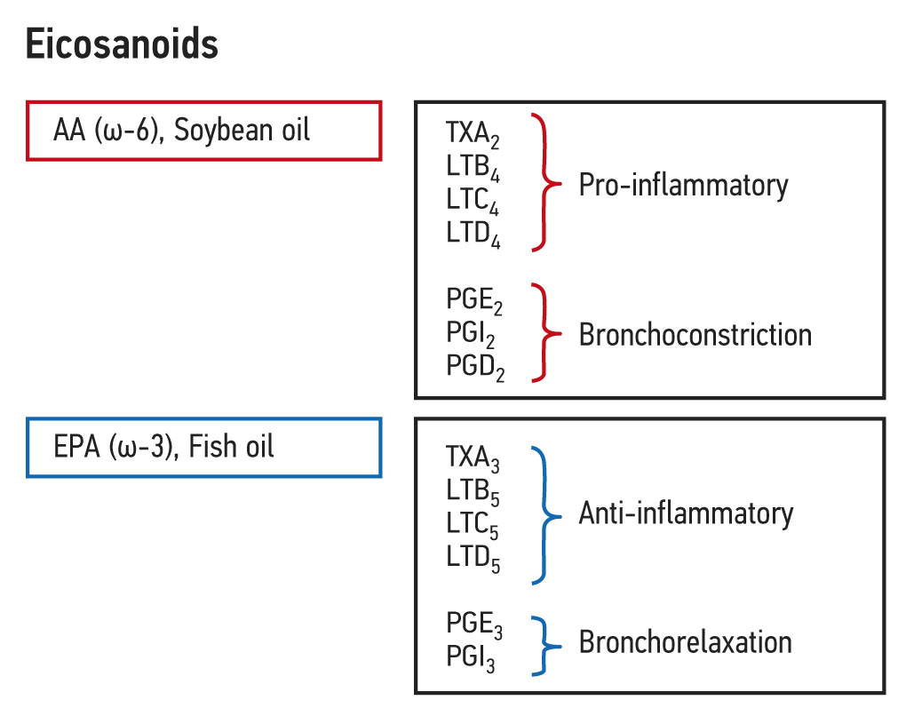 Arachidonic, eicosapentaenoic, and docosahexaenoic acids are sources of biologically active lipid mediators, [22] of which the best known are eicosanoids, including prostaglandins, thromboxanes, and leukotrienes. Arachidonic acid (omega-6 fatty acids) is a known precursor of pro-inflammatory thromboxanes 2-series, pro-inflammatory leukotrienes 4-series, and prostaglandins 4-series with bronchoconstriction properties. On the contrary, eicosapentaenoic acid is used for the synthesis of anti-inflammatory thromboxanes 3-series, leukotrienes 5-series, and prostaglandins 3-series with bronchorelaxation properties. The functional significance of this process is revealed by the anti-inflammatory effect of the metabolic products of eicosapentaenoic acid. Increased levels of eicosapentaenoic acid in the diet or PN solution leads to partial replacement of arachidonic acid by eicosapentaenoic acid in cell membrane phospholipids, which reduces the synthesis of pro-inflammatory eicosanoids from arachidonic acid and increases the synthesis of anti-inflammatory eicosanoids from eicosapentaenoic acid (see Figure). Therefore, considering the biological value of fatty acids, they shall never be excluded from the diet or nutritional support.