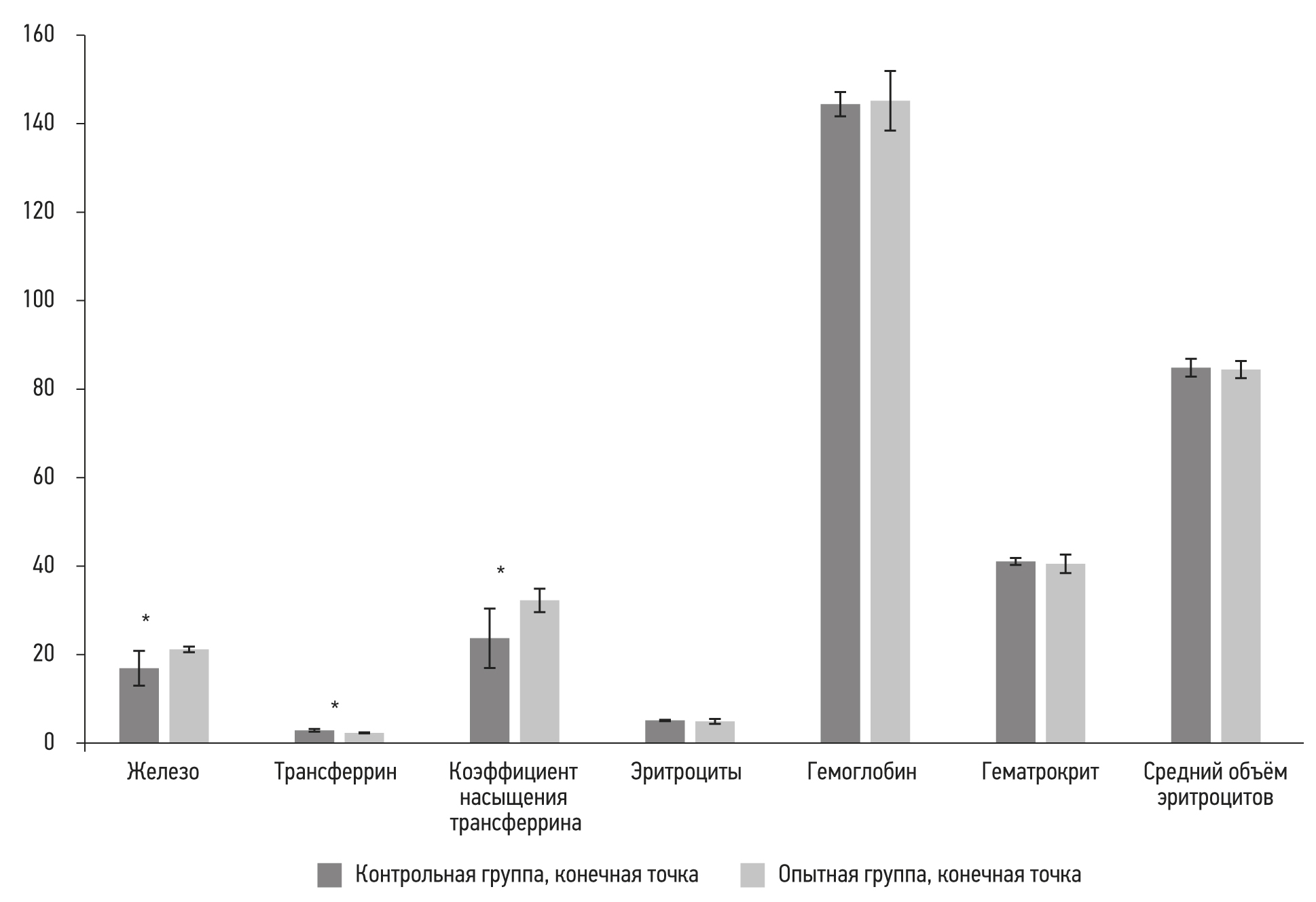 У спортсменов опытной группы на фоне приёма свекольного сока спустя 20 дней происходит достоверное увеличение содержания железа в крови с 16,90±1,97 до 21,18±0,28, коэффициент насыщения трансферрина с 23,68±3,36 до 32,25±1,18, тогда как содержание трансферрина уменьшается с 2,89±0,15 до 2,31±0,15.