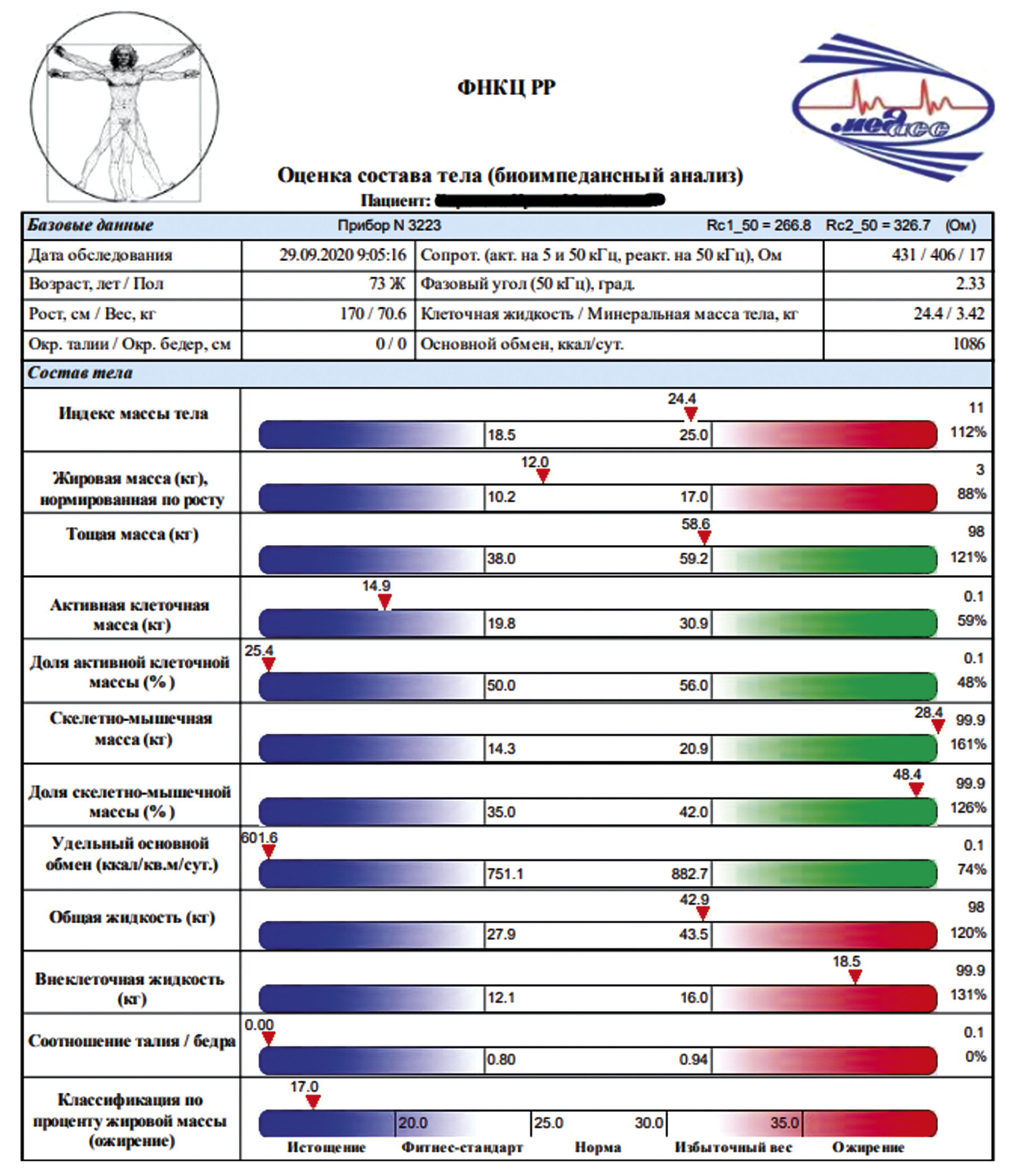 Параметры нормированных значений биоимпедансного анализа для соответствующих половозрастных категорий предоставляются производителем прибора1 и автоматически пересчитываются при проведении исследования (рис. 1).