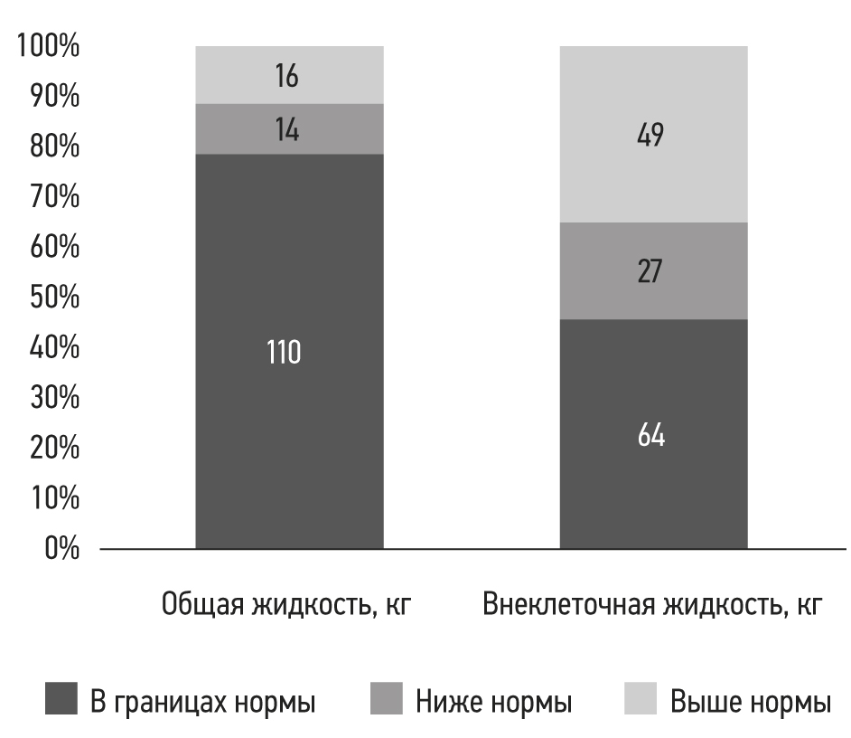 Обратило на себя внимание, что в большинстве случаев объём общей жидкости организма у пациентов находился в пределах половозрастной нормы (78,6%, или 110 измерений), однако объём внеклеточной жидкости достигал нормальных значений лишь в 45,7% случаев (64 измерения) (рис. 2). При этом оба показателя одновременно находились в пределах нормы лишь в 44,3% случаев (62 измерения) (рис. 3).