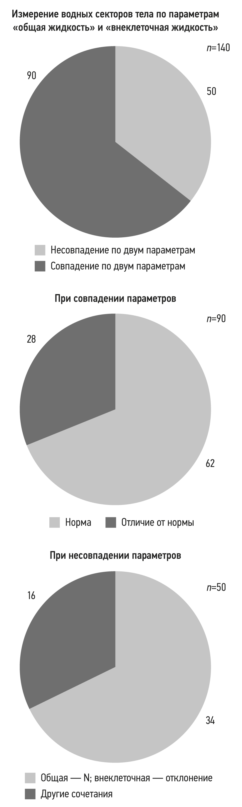 При дальнейшем анализе этих параметров (рис. 2) было установлено, что уровни объёма общей и внеклеточной жидкости не совпадают в 35,7% случаев (50 измерений). Наиболее частым вариантом при этом оказалось повышение уровня внеклеточной жидкости при сохранении нормального показателя общей жидкости тела (34 измерения, или 24,3% случаев).