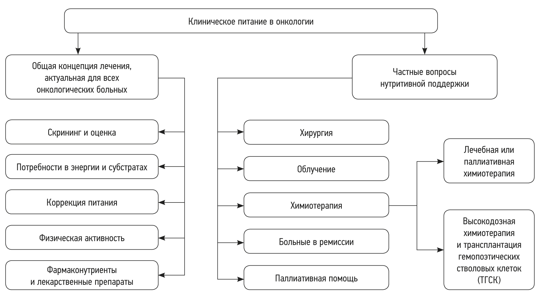 Рис. 1. Структура практического руководства ESPEN «Клиническое питание в онкологии». Модифицировано из [1]. / Fig. 1. Structure of the ESPEN practical guideline “Clinical nutrition in cancer”. Modified from [1].