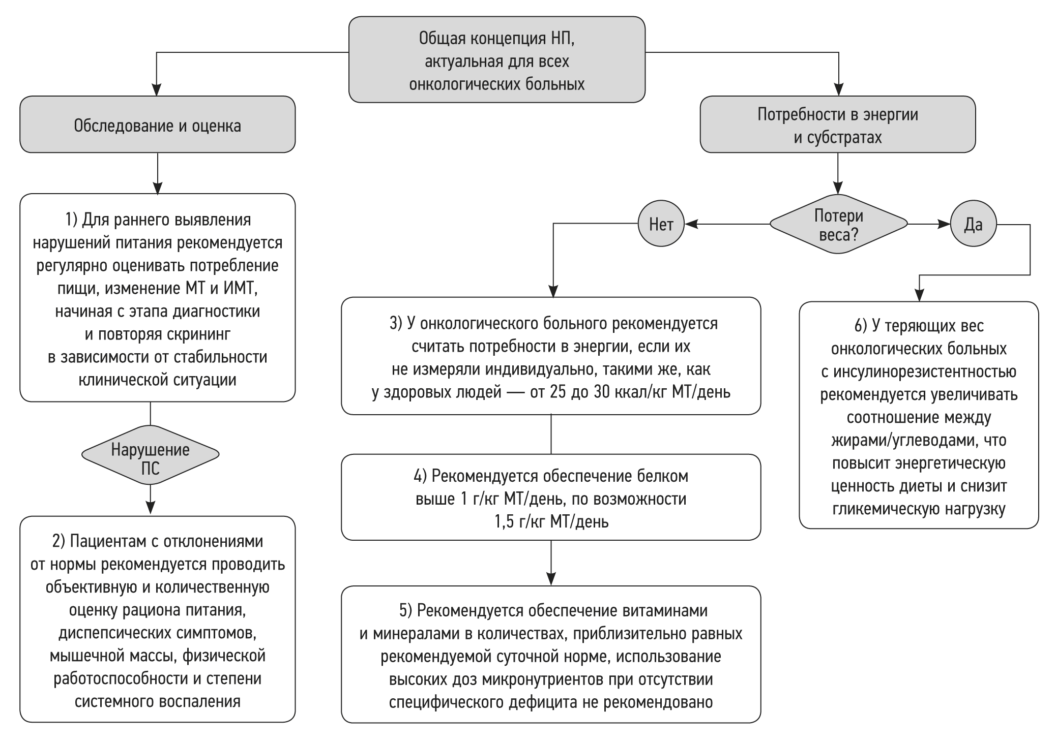 Рис. 2. Общая концепция нутритивной поддержки, актуальная для всех онкологических больных: обследование и оценка, энергетическое и субстратное обеспечение. Модифицировано из [1]. Примечание. ИМТ — индекс массы тела; МТ — масса тела; НП — нутритивная поддержка. / Fig. 2. General concepts of treatment relevant to all cancer patients: screening and assessment, energy and substrate requirements). Modified from [1]. Note: ИМТ — body mass index; МТ — body mass; НП — nutritional support.