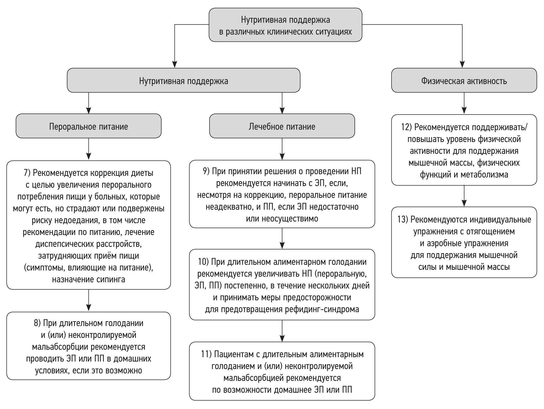 Рекомендация 9. При принятии решения о проведении нутритивной поддержки рекомендуется энтеральное питание (ЭП), если, несмотря на коррекцию (консультирование, сипинг), пероральное питание оказывается неадекватным. ПП следует назначать, если ЭП недостаточно или невыполнимо (сильный консенсус).