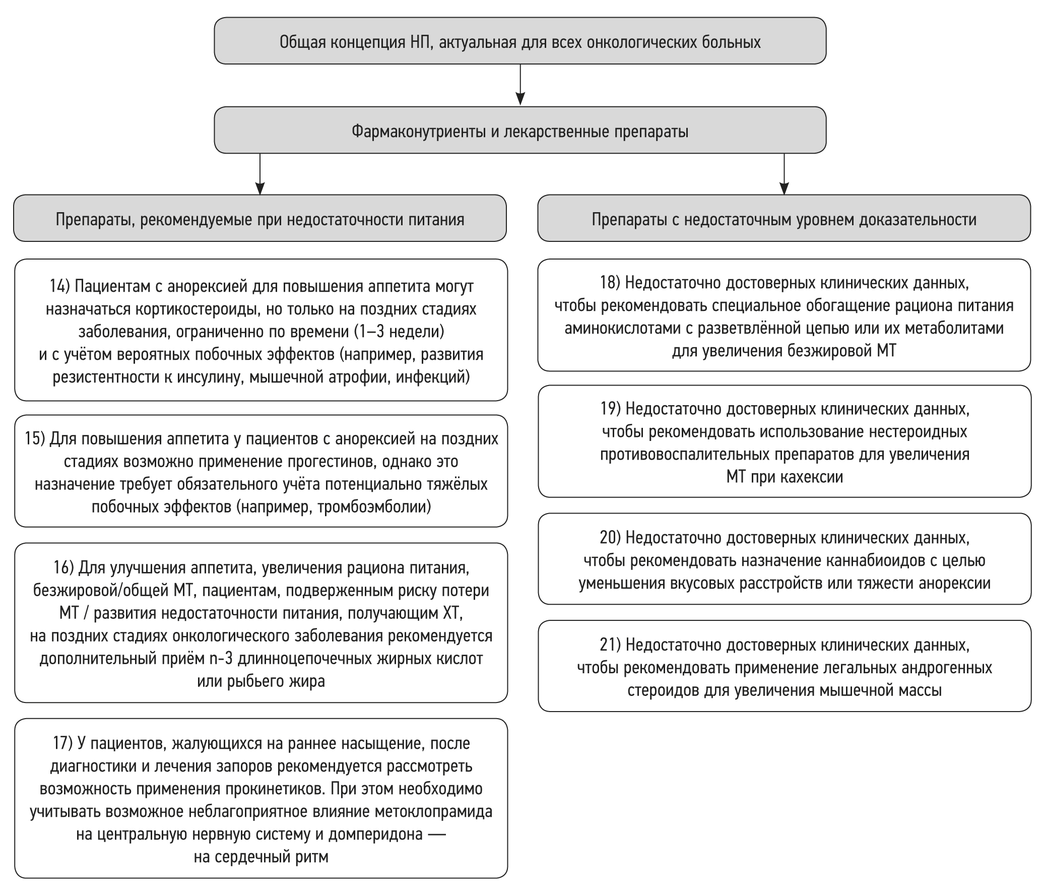 Показано, что оценка нутритивного статуса, его контроль на этапах диагностики, лечения и реабилитации, своевременная коррекция нарушений с момента постановки диагноза позволяют добиться лучших результатов противоопухолевого лечения [1]. Тем не менее, иногда опухоль-ассоциированная недостаточность питания воспринимается как вторичная проблема, которой не уделяется должного внимания. В клинической практике это приводит к тому, что своевременно не проведённый скрининг нутритивной недостаточности и коррекция нутритивного статуса часто влечёт за собой его дальнейшее ухудшение и в конечном счёте снижает эффективность противоопухолевой терапии. Не удивительно, что в последние годы опубликовано большое число рекомендаций по клиническому питанию в онкологии как национальных, так и международных обществ специалистов по онкологии, поддерживающему лечению или клиническому питанию. Однако оценить потенциальный вклад питательной поддержки в успех противоопухолевого лечения, а, следовательно, целесообразность, варианты, дозу и компоненты искусственного питания в разнообразных клинических ситуациях, при различном ответе на противоопухолевое лечение и многообразии осложнений, да ещё и в полном соответствии с достаточно жёсткими требованиями, предъявляемыми к доказательным рекомендациям, очень непросто. Как следствие, в этой области велика доля рекомендаций, фактически не соответствующих критериям AGREE II (Appraisal of Guidelines for Research and Evaluation II), например, использующих для обоснования одного тезиса результаты исследований с различными критериями включения, режимами питания и оценке получаемых результатов. Фактически, анализ 17 национальных и международных рекомендаций по клиническому питанию в онкологии, принятых в 2017–2019 гг., показал, что общий показатель качества выше 60% был достигнут только в соответствующих рекомендациях Европейского общества клинического питания и метаболизма (ESPEN) [2] и рекомендациях Национального общества клинического питания Австралии. Качество рекомендаций оценивалось по соответствию исследований, использованных для их обоснования, требованиям AGREE II, а научная согласованность сформулированных рекомендаций — по шкале измерения степени согласия MSRA (Measurement Scale of Rate of Agreement) [3].