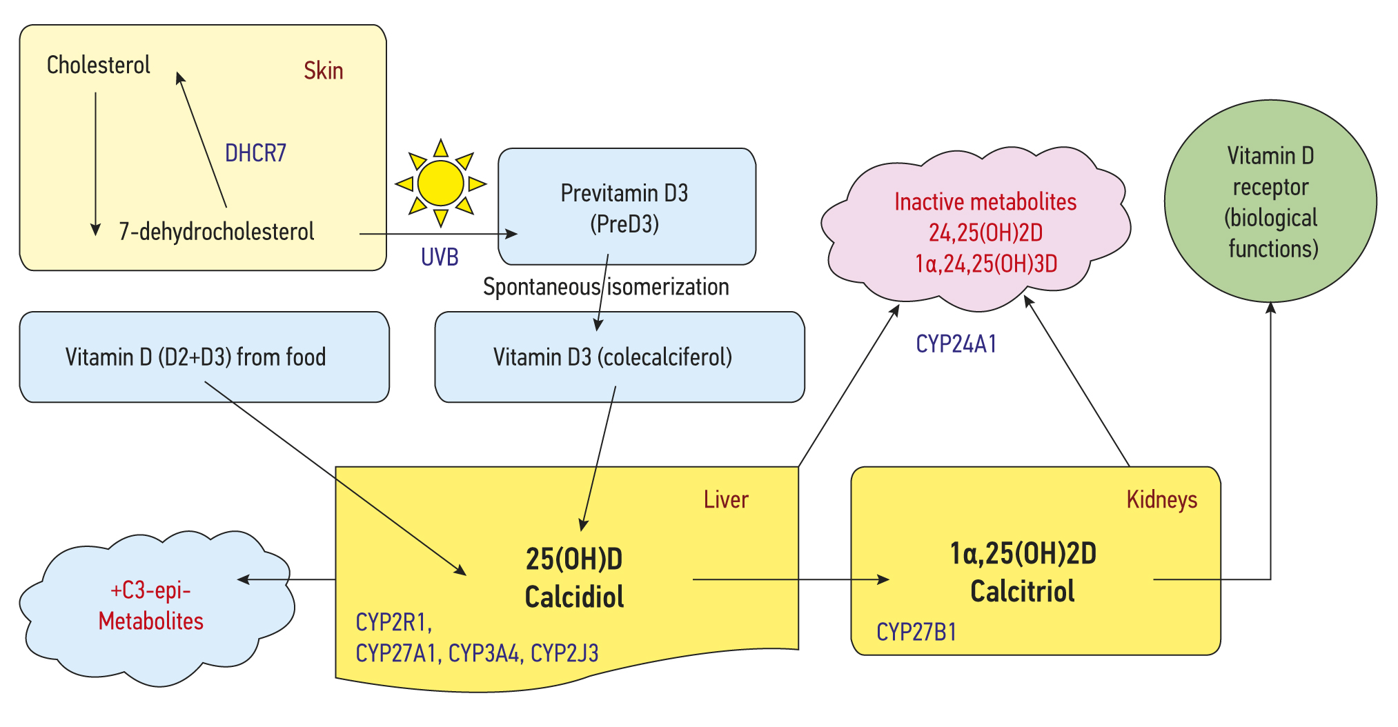In certain clinical conditions, such as suspected CYP24A1 deficiency, hypophosphatemic syndrome, and granulomatous, or lymphoproliferative diseases, the blood serum levels of 1,25(OH)2D and 24,25(OH)2D can be measured as an additional diagnostic method. 1,25(OH)2D circulates in blood at concentrations up to 1,000 times lower than that of 25(OH)D and has a significantly shorter half-life of approximately 4 h. This metabolite is highly regulated by parathyroid hormone, FGF23 protein, calcium, and phosphorus in the blood and does not reflect the reserves of 25(OH)D in the body. The use of these methods is currently limited by the low prevalence and availability of these research methods [32–34].