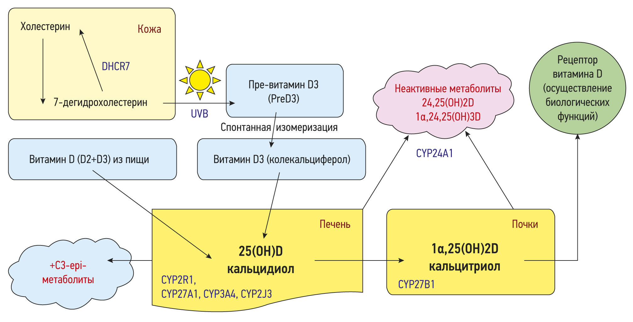 В организме человека D3 производится из 7-дегидрохолестерина (7DHC) ― промежуточного звена в синтезе холестерина. Воздействие бета-лучей ультрафиолетового света (ultraviolet B, UVB) в диапазоне 290–315 нм осуществляет электроциклическую перестройку кольца в положении C9–C10 с образованием превитамина D (PreD3). После образования PreD3 происходит термическая изомеризация в витамин D3 (VitD3) со сдвигом атома водорода от C19 до C9 [8]. Синтез колекальциферола зависит от концентрации 7DHC, которая, в свою очередь, зависит от активности 7-дегидрохолестеролредуктазы (DHCR7). Этот фермент катализирует обратимое восстановление 7DHC до холестерина [9].